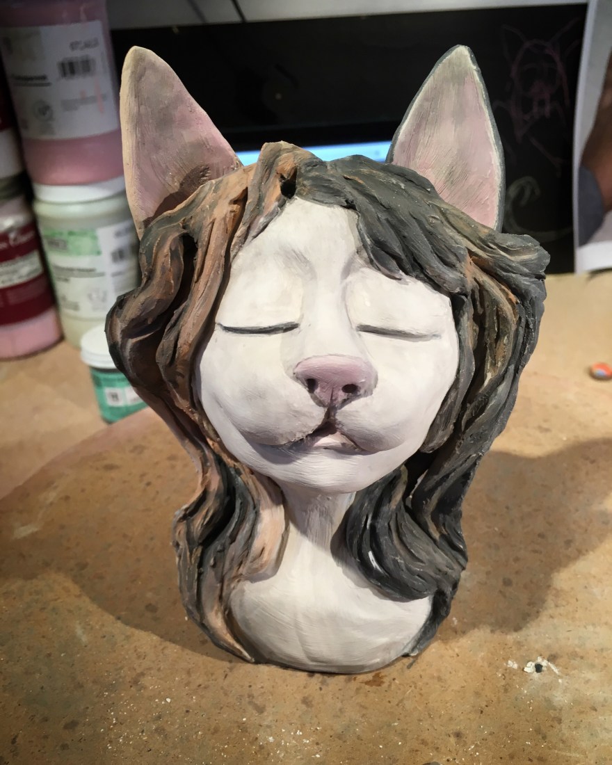 Today was no exception, though I hoped for more, I’m proud of what I’ve accomplished (at least that’s what I keep telling myself). I fired the kiln with a commissioned piece hopefully to completion (enter prayer to the kiln gods here) and listened to a webinar about Etsy selling and focused on some social media content. I did under glaze a cat lady sculpture too, but I wish I had created more. I have to say, wanting to be a working artist sometimes feels more about admin work then creating, but hopefully all this work someday pays off.